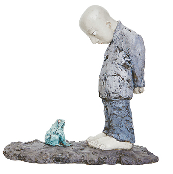 中國(guó)傳統(tǒng)文化在人與物的關(guān)系上強(qiáng)調(diào)“合一” ,強(qiáng)調(diào)神與物游,體味自然之神妙。在該展的主題上,雕塑作品大多圍繞人與自然生態(tài)的和諧、人與社會(huì)的和諧等展開(kāi), 《人與蛙》 《破風(fēng)》《再生》 《彩虹》 《異域》 《倒影》 《中國(guó)風(fēng)景》 《樹(shù)》《開(kāi)合》 《自由之外》等皆是如此。由王少軍創(chuàng)作的《人與蛙》以人與蛙相互對(duì)立、互相凝視構(gòu)成一組對(duì)比圖,作品中人的眼神好奇、迷茫,蛙的眼神堅(jiān)定、無(wú)畏,在二者的互相“審視”中,仿佛說(shuō)出了人與動(dòng)物的相處焦慮,也警告著我們應(yīng)有的對(duì)自然的尊重,而將其放置于沙灘前的草地上,似乎也在寓意著回歸自然;武定宇創(chuàng)作的《溪山·聞聲》以不銹鋼為固體線條制作成一幅立體鏤空的“溪山圖” ,厚重的框架好似一幅相框,而蜿蜒的線條繪出了山與溪的形狀,四周的樹(shù)木叢林透過(guò)空出的部分進(jìn)入畫面,仿佛該作品與周圍的樹(shù)林合為一體,立刻有了生機(jī)。無(wú)論是作品本身對(duì)人與自然關(guān)系的哲思,還是現(xiàn)實(shí)中這些作品與周圍環(huán)境的互動(dòng),都是將“合一”的價(jià)值用雕塑呈現(xiàn)出來(lái)。