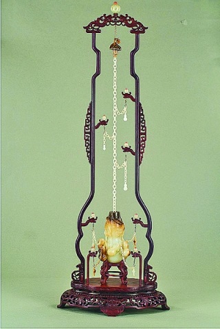 有著幾十年治玉經(jīng)歷的中國工藝美術大師楊根連,歷時多年的研究整理研究,終于在2003年拯救性地恢復了曾兩度失傳的金鑲玉工藝。由楊根連恢復并創(chuàng)新的金鑲玉工藝,一改舊時黏合鑲嵌的做法,僅靠金玉兩種材質(zhì)間不同的質(zhì)地結合起來,通體無膠,其工藝特點是玉面平整溫潤,金絲與玉完美結合,沒有凹凸感,形成金玉交輝的工藝佳品。