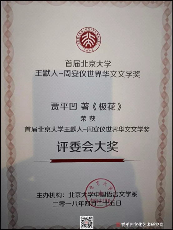 賈平凹長篇小說《極花》榮獲首屆“北京大學王默人-周安儀世界華文文學獎”評委會大獎