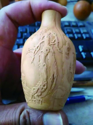 “我的作品,主要是以人物為題材,吸收了國畫、內(nèi)畫、玉雕以及牙雕的一些技法,作品層次分明,刀法細(xì)膩,人物特點(diǎn)突出?!毙爝B龍說,制作一個(gè)好活兒,往往需要一個(gè)多月的時(shí)間,“首先要選料,在制作砑花之前,葫蘆的選擇是非常重要的一個(gè)環(huán)節(jié),要選擇皮質(zhì)厚實(shí)、形狀規(guī)正、表皮光滑無傷的葫蘆為佳。其次要設(shè)計(jì),根據(jù)葫蘆表面的紋理或肌理設(shè)計(jì)圖案,出設(shè)計(jì)稿。接下來用鉛筆起稿,把圖案繪制在葫蘆上,再用鈍針將設(shè)計(jì)稿刻畫出來,擦除鉛筆印痕。這樣就可以開始砑花制作,用不同的刀具依據(jù)圖案進(jìn)行不同層面的刻畫和推壓,形成層次。再以精細(xì)的刀具刻畫圖案內(nèi)部的結(jié)構(gòu),最終完成作品?!毙爝B龍強(qiáng)調(diào),完成作品之后,還需要用細(xì)軟的布料進(jìn)行擦拭和盤玩,以保證制作完成的作品表面精細(xì)光亮。