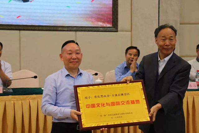 白庚勝代表“一帶一路”中國文化教育與國際交流基金為重慶黑山谷·龍鱗石海景區(qū)授牌