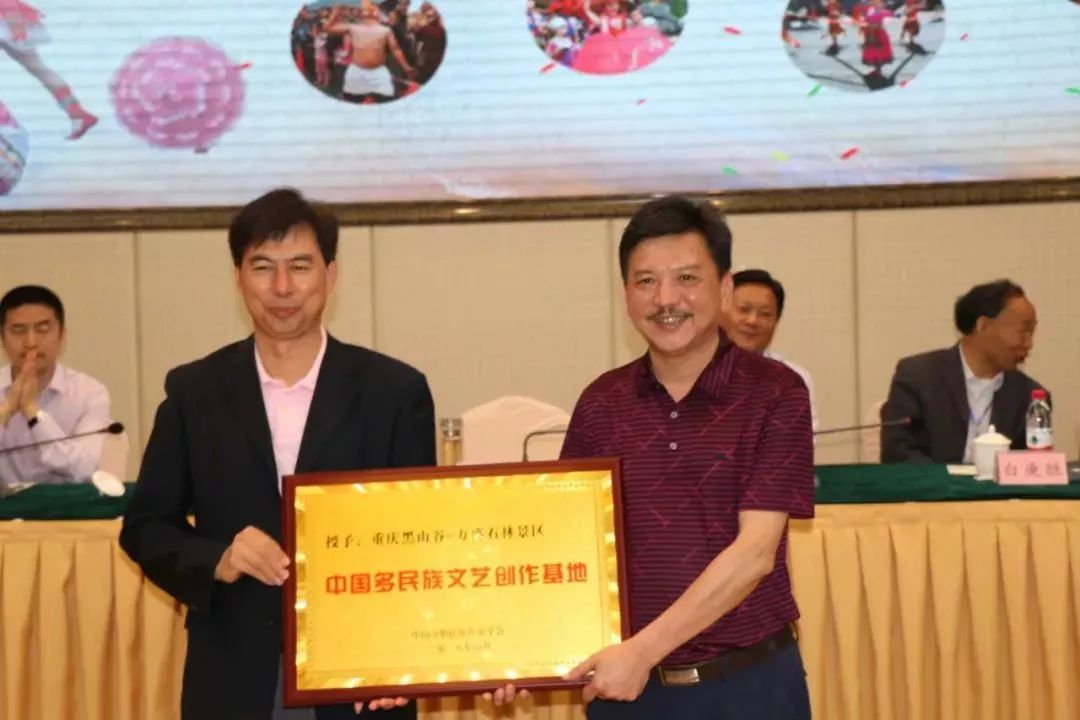 趙晏彪代表中國少數(shù)民族作家學(xué)會為重慶黑山谷·龍鱗石海景區(qū)授牌