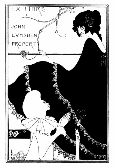 約翰·拉姆斯頓·普羅伯特設計的藏書票。比亞茲萊善于用大面積、強烈對比的黑白塊面,表現(xiàn)出設計理念和手法的獨創(chuàng)性,線條極為單純,沒有陰影,更沒有中間色調(diào)。
