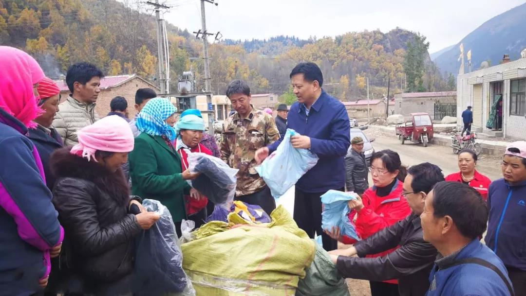 青海省文聯(lián)黨組書記、主席班果為扶貧村村民發(fā)放御寒衣物