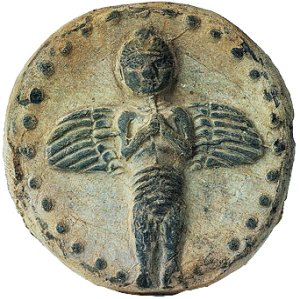 2014年,新疆維吾爾自治區(qū)博物館舉辦的《絲路遺珍匯天山——西北五省文物精品展》,就陳列了一件具有異域特色的瓦當(dāng)。這件瓦當(dāng)直徑13厘米,由青海省民和回族土族自治縣川口水泥廠出土。瓦當(dāng)上繪一羽人,圓臉,大鼻子、大眼睛,上身赤裸,梳圓形發(fā)髻。羽人雙手合十于胸前,背上有雙翼,周?chē)月?lián)珠紋作環(huán)狀圍繞。