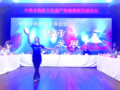 中國非物質(zhì)文化遺產(chǎn)傳統(tǒng)舞蹈發(fā)展論壇現(xiàn)場,演員展示舞蹈動作。張 婷 攝