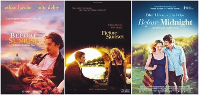 《愛在黎明破曉前》展現(xiàn)了這對(duì)男女初遇時(shí)的聰明和害羞,發(fā)生在20歲左右、人生第一次浪漫的偶遇;《愛在日落黃昏時(shí)》則在觀眾的翹首期盼中誕生,也如大家期盼的那樣讓兩人在錯(cuò)過之后再次重逢。比起《愛在黎明破曉前》里兩人想要了解對(duì)方的渴望,《愛在日落黃昏時(shí)》里的兩人把欲望藏在了自我保護(hù)之下,隨著他們一路走著,走過巴黎的大街小巷,才逐漸撕下偽裝。而他倆中年的家庭生活轉(zhuǎn)折點(diǎn)發(fā)生在《愛在午夜降臨前》里,他們始終在討論關(guān)于工作、孩子、休假等各種日常話題———展現(xiàn)出愛情在歲月和現(xiàn)實(shí)打磨后中更艱難的一面。