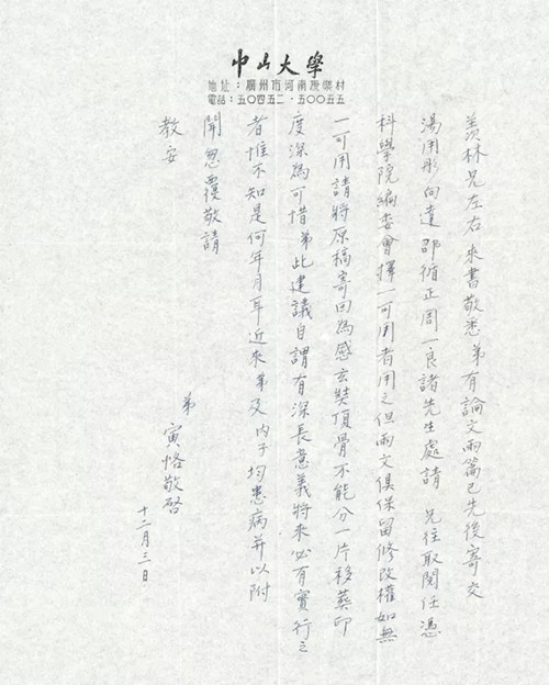 信中所提“科學院編委會”,“科學院”為“中國科學院”,成立于一九四九年,首任院長為郭沫若。“編委會”當是《歷史研究》這一期刊的編輯委員會。一九五三年九月二十一日,中共中央組建的歷史問題研究委員會召開了第一次會議,其間,中宣部提議成立三個歷史研究所,陳寅恪為中古史所長的最有力人選。此外,會議的另一任務是出版一份史學界的刊物。十月七日,郭沫若電函陳寅恪,聘請他擔任中古史所長,并為次年正式刊行的《歷史研究》創(chuàng)刊號向他征稿。陳寅恪復電推辭了所長一職。(卞僧慧《陳寅恪先生年譜長編》,中華書局,2010年,280—281頁)出人意料的是,陳寅恪此前的得意門生汪篯在十一月執(zhí)郭沫若信,親自南下嶺南,力勸其北上就職。師徒的談話最終不歡而散,陳寅恪對此的態(tài)度集中體現(xiàn)在十二月一日由其本人口述、汪篯筆錄的《對科學院的答復》一文中。不過,關于《歷史研究》組稿一事,陳寅恪并未拒絕。后來正式公布的《歷史研究》第一屆編委的十八人名單中,陳寅恪、湯用彤、向達、季羨林皆赫然在列(蓋志芳《〈歷史研究〉(1954—1966)編委遴選及變動原因分析》,《東岳論叢》2010年第1期)。可以肯定的是,此前不久歷史所已與他們協(xié)商過進入《歷史研究》編委之事,并告知了其他被選人員的答復?;蛟S此時已同意受聘為《歷史研究》編委的季羨林在致陳寅恪的信中亦傳達了約稿之意,所以,在十二月三日陳寅恪給季羨林的回信中,首先提及“兩篇論文”之事。一方面,因這兩篇文章之前曾寄給好友湯用彤和向達,此二人與季羨林皆在《歷史研究》編委內(nèi),故后者正可順便取閱,以備評審刊用事宜;另一方面,給季羨林的這一回信亦間接答復了郭沫若此前的稿約。從《對科學院的答復》中,不難看出陳寅恪對“時尚”與“新學”積怨之深(陸鍵東《陳寅恪的最后二十年》,111頁),而在當時的歷史學界內(nèi)引領時尚與“新學”的代表人物,無疑非郭沫若莫屬。因此,在經(jīng)歷了與學生汪篯的不愉快的談話后,不回復或間接回復郭沫若《歷史研究》約稿一事,應是陳寅恪比較妥帖的處理方式,而此信之回復正可“一舉兩得”。