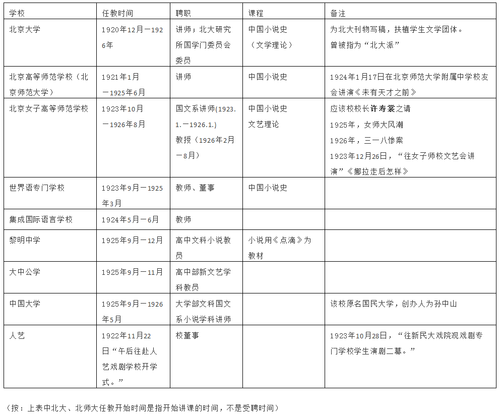 1920年8月,魯迅接受北京大學聘任,從12月開始,在北大講授“中國小說史”,自編講義《中國小說史略》,還曾翻譯廚川白村《苦悶的象征》作為教材講授文學理論,任教至1926年8月離京為止。魯迅在北京多所學校的任教情況參見下表: