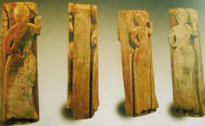 1996年新疆文物考古工作者在民豐縣尼雅遺址中發(fā)現(xiàn)的一組四件木雕舞蹈人像