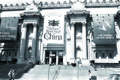 1980年4月12日至7月9日,“偉大的中國青銅時(shí)代”展覽赴美國紐約大都會藝術(shù)博物館展出,博物館門口懸掛起巨幅展覽海報(bào)。