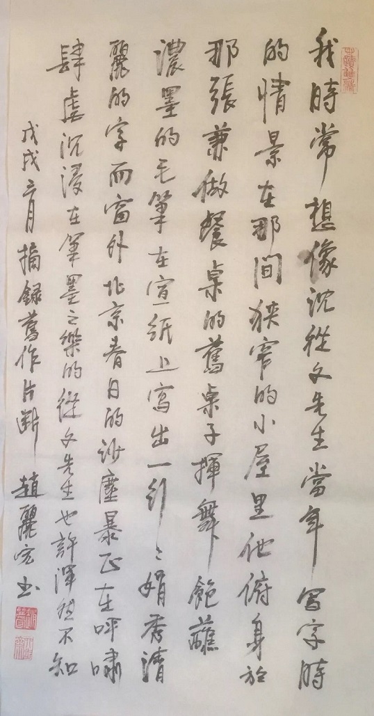 第二年我去北京把沈從文的書法長卷還給曹辛之時,他欣然一笑,說:“我以為你不想還我了呢!”說罷,拿出家里所有的沈從文書法,讓我仔細欣賞,并且一定要我從中挑選一幅。