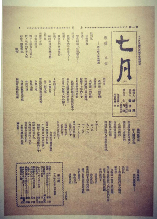 《七月》1937年9月11日創(chuàng)刊,周刊。胡風編輯。七月社發(fā)行。出版地上海。出至第3期停1刊。同年10月16日在武漢復刊刊,改為半月刊,期號另起,上海雜志公司發(fā)行。次年再度停刊。1939年7月又在重慶復刊,改為月刊,華中圖書公司發(fā)行。1941年9月終刊。前后共出35期。