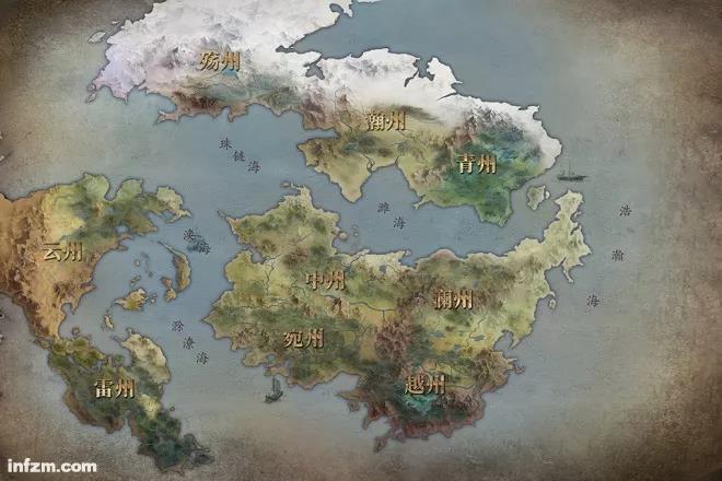 中州的都城位于大陸正中,交通便利,且處于盆地中央,易守難攻,歷代都是人族的權(quán)力中心。中州以南的宛州地勢平坦,物產(chǎn)豐富,加之偏安一隅,與相鄰各州有高山大澤為屏障,總能避開戰(zhàn)禍,因此成為商人云集的財富中心。瀚州草原與中州西北面隔海相望,游牧民族生產(chǎn)力落后,常為資源渡海劫掠。