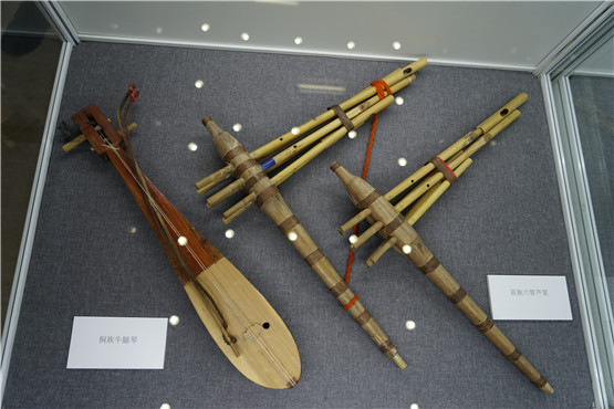 非遺展上展出的侗族牛腿琴(左)、苗族六管蘆笙(右) 陳澤宇 攝