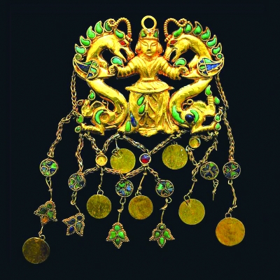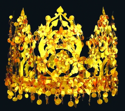 出土于蒂拉丘地墓葬群的眾多金器是展覽的最大亮點(diǎn)。這些璀璨奪目的金器,包括造型奇美、巧奪天工的純金王冠;裝飾有多組希臘酒神狄俄尼索斯徽章、工藝精湛的純金腰帶;足金打造的巴克特里亞阿芙洛狄忒金像的胸飾、騎海豚的厄洛斯金鉤扣,以及鑲滿(mǎn)綠松石的黃金寶劍、嵌有眾多寶石的黃金項(xiàng)鏈等,都是璀璨奪目的無(wú)價(jià)之寶。