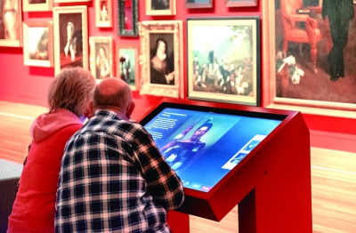 一對(duì)老夫婦在“Toi藝術(shù)”展覽的肖像畫單元使用數(shù)字化導(dǎo)覽設(shè)備