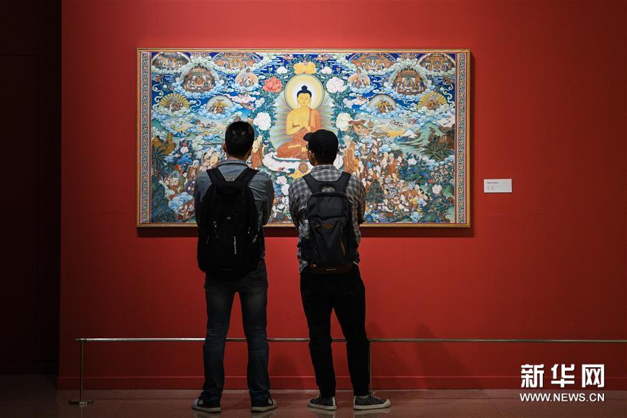 觀眾在展覽上欣賞唐卡作品《釋迦牟尼說(shuō)法圖》。