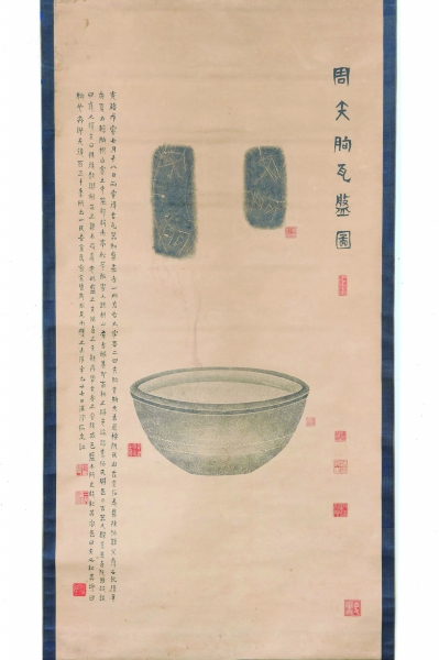 山東省濰坊市博物館藏周矢朐瓦盤拓軸,紙質(zhì),縱103厘米、橫51厘米。該拓軸由著名拓工姚學(xué)桓繪圖刻版拓墨、金石學(xué)家陳介祺考釋題跋,并經(jīng)民國(guó)收藏家周振湘收藏,具有較高的學(xué)術(shù)價(jià)值。