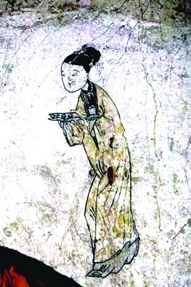 該墓為多室墓,在其中一室中發(fā)現(xiàn)4幅壁畫及一些陪葬品碎片。4幅壁畫中,一幅是侍女端酒圖,兩幅是菊花圖,另一幅則因殘缺不全看不清場景。