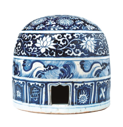 此件青花瓷“蒙古包”形器完好無(wú)損,從造型看:上半部呈半球形、下半部為圓柱體,平底,下方開(kāi)有裝飾壸門(mén)的龕式小門(mén);從裝飾看:表體施釉、白底青花為主,紋飾分五層,頂部圓心繪“穿云飛鵝”,之下依次為 “纏枝菊花”、“纏枝蓮花”、“海水卷浪”和“焰珠雜寶”。該器整體高18厘米,底部直徑18.5厘米。目前,對(duì)其時(shí)代判斷、造型詮釋、用途分析、紋飾寓意都有各種不同的理解。艾爾米塔什博物館認(rèn)為 “蒙古包”形器可能燒制于1345至1355年,胎、釉、青花料和繪畫(huà)品質(zhì)都很高,推斷是景德鎮(zhèn)為蒙元宮廷特別生產(chǎn)的;而彭濤先生則認(rèn)為,從圖案可見(jiàn),其纏枝蓮紋的蓮葉已全部是卷草紋樣式,是明初洪武的風(fēng)格。但將此器的時(shí)代推定在14世紀(jì)后半葉的范圍內(nèi)是大致沒(méi)有爭(zhēng)議的。