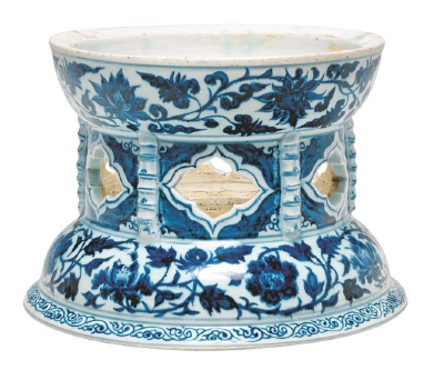 這使我們聯(lián)想到另一件元青花瓷器——英國(guó)劍橋大學(xué)菲茨威廉博物館收藏的一件 “青花纏枝花卉紋鏤空器座”,高28.9厘米、口徑 23.5厘米、底徑27.4厘米,整體圓形,由上、中、下三部分組成?!吧喜砍?,中部束腰,下部外撇,整器上下貫通,中空……上部外壁繪纏枝蓮紋;腰部以凸起的半埋式竹節(jié)狀豎棱分割為六面,每根竹節(jié)狀豎棱都有七節(jié),在每節(jié)上都用青花繪線條,腰部的六個(gè)面均有一鏤空的菱花形開(kāi)光,開(kāi)光周邊空白處也均用青花紋飾填滿;下部外壁繪纏枝牡丹紋,足墻為一圈卷草紋?!?/p>