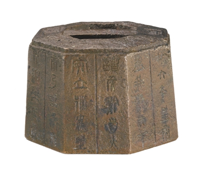 秦銅器。高6.5厘米,口徑8.3厘米,底徑9.5厘米。銘文102字,分布于橫梁左右兩側及權體八面。