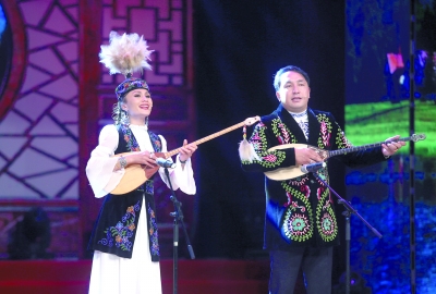提留哈布·賽爾山別克與丁娜·阿扎提在曲藝周開(kāi)幕式上表演哈薩克族鐵爾麥《如果這樣有什么用》。