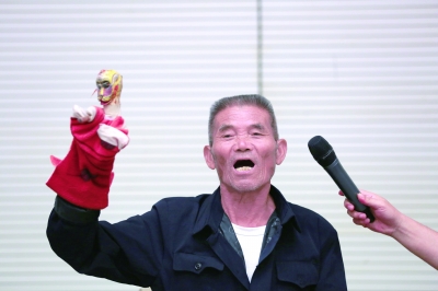 圖為湖南邵陽(yáng)布袋戲國(guó)家級(jí)代表性傳承人劉永安在展示他表演中所用的木偶。(圖片由國(guó)家圖書館提供)