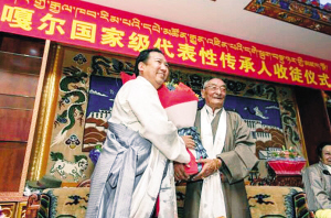 95歲的平措玉杰和80歲的扎西次仁,是國家級非物質文化遺產嘎爾僅有的兩位國家級代表性傳承人。6月8日,在西藏舉行的國家級非物質文化遺產嘎爾國家級傳習基地授牌儀式上,他們新收了4名徒弟,為古老藝術——嘎爾的傳承和發(fā)展增添了新鮮血液。