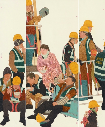 在本屆全國青年美展上,關(guān)注現(xiàn)實、扎根生活的作品讓人耳目一新,印象深刻。張眾的中國畫《北京新機場·筑夢英雄志》歌頌了機場建設(shè)者們?yōu)閭ゴ髸r代添磚加瓦的勞動精神,婁敏的綜合材料作品《新時代的勞動者》表達(dá)了作者對新型勞動者的敬意,何永興的油畫《收獲者》、曹宏倫的油畫《漁獲夕陽》傳遞著豐收的喜悅,曹文惠的《女劍客》、陳林的《鋼與泥·格斗》等油畫作品塑造了中國軍人日常訓(xùn)練或執(zhí)行任務(wù)時的英武形象,曹雁楠的連環(huán)畫《逐夢長空》之一以飛機倒懸場景展現(xiàn)了空軍飛行員的藍(lán)天英姿,沈曉明的中國畫《曦風(fēng)》生動表現(xiàn)了消防官兵們?yōu)楸Wo人民生命財產(chǎn)安全所做出的努力。除了對國家建設(shè)者和保衛(wèi)者的謳歌,參展作品還以多種多樣的形式展現(xiàn)了新時代的中國風(fēng)貌,如張靜的中國畫《中國速度》以動車組列車表達(dá)了對國家科技騰飛的禮贊,張旭的油畫《筑夢曲·四》以斑駁的色彩營造出濃郁的工業(yè)氣息,盧妙玲的漆畫《平行的世界》用紛繁復(fù)雜的平行線條切割畫面,為觀者呈現(xiàn)了現(xiàn)代化城市建設(shè)的欣欣向榮。此外,蔡曉斌的油畫《南小河邊的秦腔》、馮瑜的油畫《喜訊》、蔣露的中國畫《地鐵九號線》、陳鵬的水彩粉畫《老有所樂》等作品展現(xiàn)了普通百姓的多彩生活。趙鴻賓的中國畫《金秋暖風(fēng)送祥音》、黃華斌的中國畫《春晨》、陳流的水彩畫《禮贊·大地》等作品則是祖國大好河山的生動寫照。