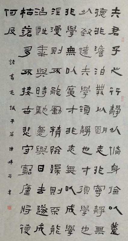 陳婷筠的隸書(shū)的確取得了一定的成就。以往的激情性書(shū)寫,放縱有余,法度不足,漫漶的結(jié)體,粗糙的線條,難以建立宏闊、凝重的價(jià)值標(biāo)準(zhǔn),也不可能形成普遍的審美共識(shí)。令我們欣然的是,新一代作家書(shū)法創(chuàng)作,逐步突破了這個(gè)“瓶頸”,以客觀、公正的藝術(shù)立場(chǎng)和系統(tǒng)的書(shū)法史知識(shí),以及沒(méi)有歷史負(fù)擔(dān)的創(chuàng)作心態(tài),嶄新的藝術(shù)感覺(jué),實(shí)現(xiàn)了當(dāng)代作家書(shū)法創(chuàng)作的一種突破。