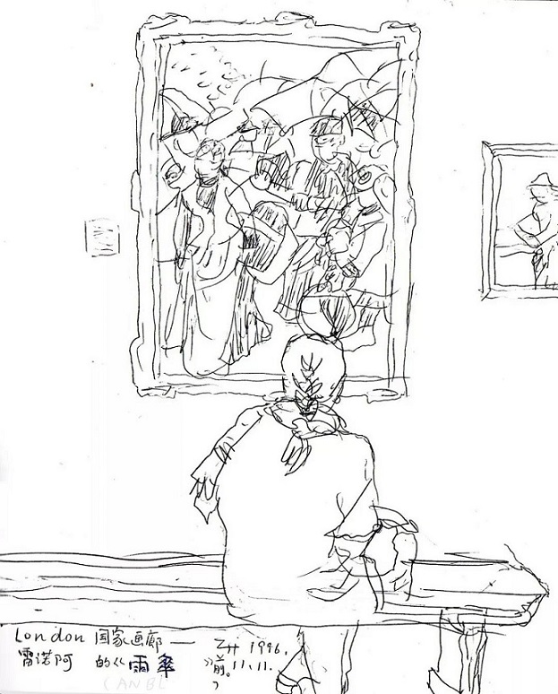 倫敦國家畫廊的藏畫《傘》前|圓珠筆|1996年|倫敦