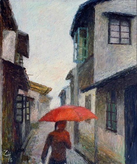 雨巷和紅傘|油畫|55.6x46.2cm|1995年