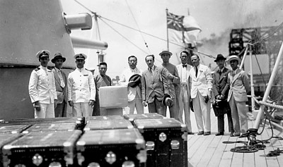 參加中國(guó)藝術(shù)英倫國(guó)際展覽會(huì)的中英工作人員與英國(guó)海軍重巡洋艦“薩??恕碧?hào)艦長(zhǎng)等合影(左四馬衡,左五為鄭天錫特派員,右二為莊尚嚴(yán),右四為唐惜芬) 資料圖片