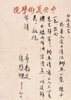 徐悲鴻在端午佳節(jié)將至之際,專門安排人給白石老人送上鰣魚、粽子等節(jié)日禮物,在信中還細心地囑咐鰣魚的烹飪方法,從中可見徐悲鴻對白石老人真切的無微不至的照料與關(guān)懷。此札書于上世紀五十年代初 (因所用信箋為 “中央美術(shù)學院”專用箋,而中央美院定名于1950年4月,悲鴻1953年9月去世,故斷定寫于1950年至1953年間),至今已有六十多年了,讀此札可知鰣魚之貴重,亦可證悲鴻與白石之交誼,真乃藝壇之佳話也。