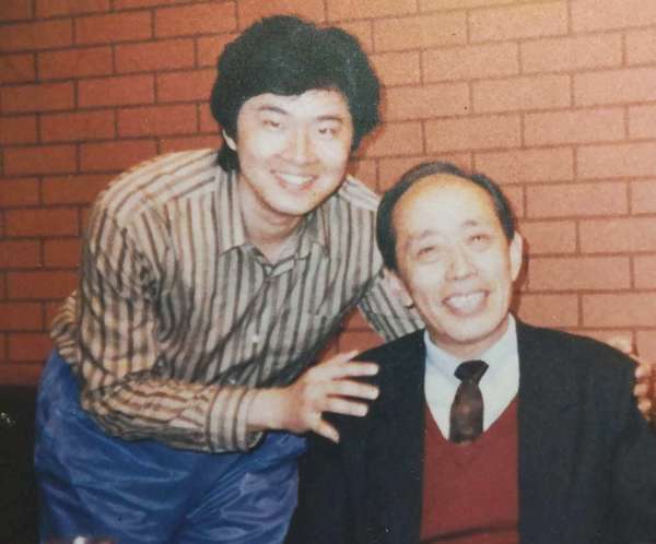 作者(左)二十年前與朱旭老師合影