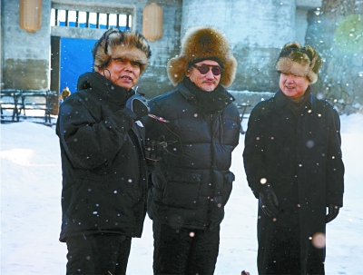 拍《智取威虎山》時(shí), 于冬、徐克、黃建新在片場(chǎng)合影(右起)