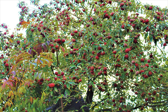 我跟著他往西邊走,約兩公里后,一座扁形的大山突然橫亙?cè)谘矍??!翱?,那叫雞素子!”李老抬手指指山腰,又指指山麓的左右兩側(cè)。我一一望去,見(jiàn)每一處都是“萬(wàn)綠叢中一點(diǎn)紅”,真真切切,非常養(yǎng)眼。山麓左側(cè)的不遠(yuǎn)處,我們走近看,見(jiàn)是一棵斜長(zhǎng)在石縫里的彎樹(shù),高約4米,叉枝又生叉枝,枝條密匝,其上綴著大小形狀均如荔枝的果兒,無(wú)以計(jì)數(shù),紅紅火火,令人心曠神怡。