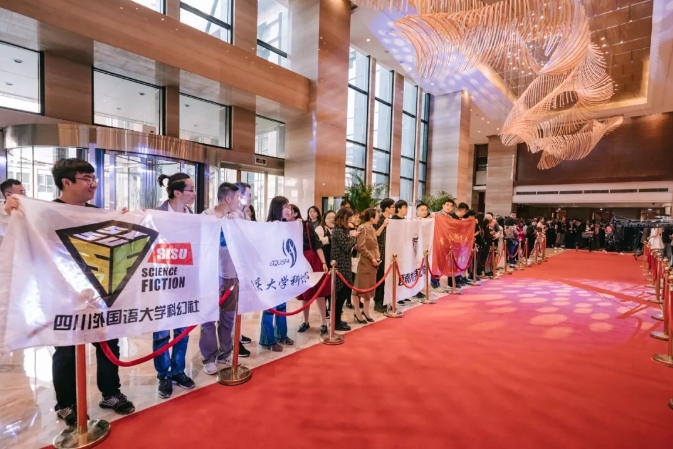 11月3日下午,頒獎(jiǎng)典禮前,作為全球華語科幻星云獎(jiǎng)一項(xiàng)重要傳統(tǒng)的入場儀式——科幻紅毯禮在重慶霧都賓館大堂盛大舉行。來自重慶大學(xué)、西南大學(xué)、重慶郵電大學(xué)、四川外國語大學(xué)、四川大學(xué)、成都理工大學(xué)、南京工業(yè)大學(xué)等多地高校科幻協(xié)會代表及重慶南開中學(xué)的眾多科幻迷們,早早地站在紅地毯旁等候,歡呼迎接科幻明星們。