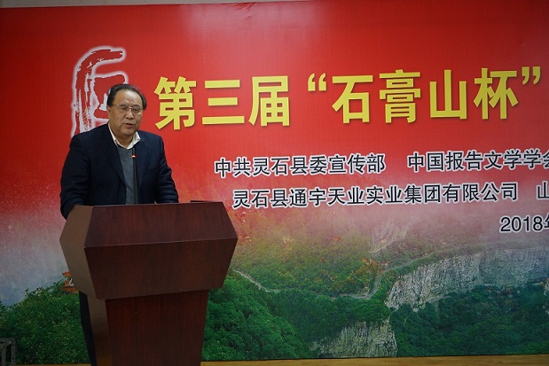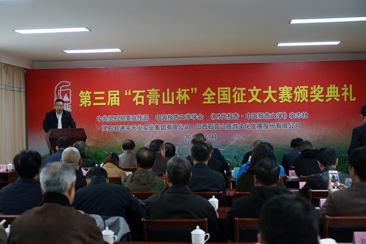 11月10日,由《時(shí)代報(bào)告·中國報(bào)告文學(xué)》雜志社和山西石膏山旅游文化發(fā)展股份有限公司共同舉辦的第三屆“石膏山杯”全國征文大賽頒獎(jiǎng)典禮在山西靈石石膏山舉行。山西省作協(xié)黨組書記、主席杜學(xué)文,中國報(bào)告文學(xué)學(xué)會(huì)常務(wù)副會(huì)長、《時(shí)代報(bào)告·中國報(bào)告文學(xué)》主編李炳銀,編輯家、作家周明,中國報(bào)告文學(xué)學(xué)會(huì)副會(huì)長、山西省作協(xié)副主席趙瑜,山西靈石縣委宣傳部副部長曹正陽,山西通宇天業(yè)集團(tuán)董事長張建新,《時(shí)代報(bào)告·中國報(bào)告文學(xué)》雜志副主編魏建軍,以及靈石當(dāng)?shù)刈骷覅⒓宇C獎(jiǎng)活動(dòng)。