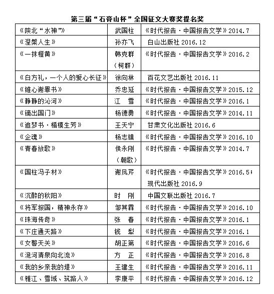 李延國、李慶華的《根據(jù)地》獲得第三屆“石膏山杯”全國征文大賽獎(jiǎng)首獎(jiǎng),獎(jiǎng)金稅前6萬元;蔣巍的《國之盾》,鐘法權(quán)的《雪蓮花開》,楊牧原的《我的爺爺是英雄》,劉東升的《朝圣故鄉(xiāng)》分別獲得第三屆“石膏山杯”全國征文大賽獎(jiǎng),獎(jiǎng)金稅前各2萬元;季志敏的《這世界不哭——廣州111號(hào)病室日記》,徐富敏的《太行山上》,張慶洲的《幸存者說:唐山警世錄續(xù)篇》,劉裕國的《你的生命之花為何如此絢爛》,牛海坤的《生命的守望者》,王少勇、陳國棟、馬亮的《地平線上的身影》,趙進(jìn)一、花葆竹的《中國又出了個(gè)“袁隆平”》分別獲得第三屆“石膏山杯”全國征文大賽獎(jiǎng)優(yōu)秀獎(jiǎng),獎(jiǎng)金稅后各1萬元。另有武國柱的《陜北“水神”》等19部作品分別獲得第三屆“石膏山杯”全國征文大賽獎(jiǎng)提名獎(jiǎng),獎(jiǎng)金各1000元。