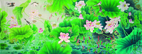 然而,今觀乎《接天蓮葉無(wú)窮碧》者,其表現(xiàn)之佳趣,或可近此。挹得天趣,蘊(yùn)無(wú)限的生機(jī),爛爛漫漫,鋪展開(kāi)去,一路的悠遠(yuǎn)、浩蕩,讓人心靜如水。這是對(duì)高遠(yuǎn)精神的禮贊。