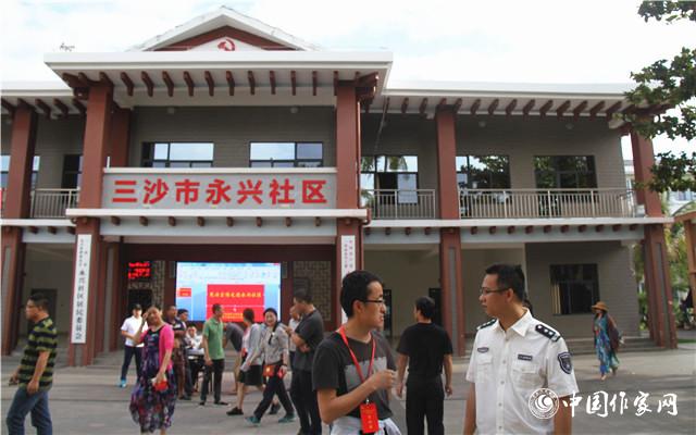 一排排嶄新的二層小樓房,整潔干凈的道路綠草如茵,雞蛋花、月季花正肆意怒放,一個美麗的現(xiàn)代化海島村莊映入眼簾。在永興社區(qū)的漁民定居點,采訪團的作家們與一位姓林的老先生交談起來,他本來是工委的干部,大學畢業(yè)就來這里,在島上工作居住了37年,現(xiàn)在已經(jīng)退休,可謂是看著永興島在改革開放以來一步一步從無到有、越來越好。談起過去的住宿、飲水困難,他感慨地說,“現(xiàn)在真的太好了!以前住木板房,現(xiàn)在住樓房,再也不怕臺風來了!”看到村民們臉上蕩漾著幸福的笑容,大家感慨萬千。海南作協(xié)專職副主席梅國云曾在四年前來到這里,他說,“四年前漁民們告訴我,他們有兩個憂慮,一個是孩子的教育問題,另一個是居住問題。但是四年后的今天,我再度上島,發(fā)現(xiàn)和四年前比完全不一樣,漁民們的住房絕不比海口的市民條件差!”