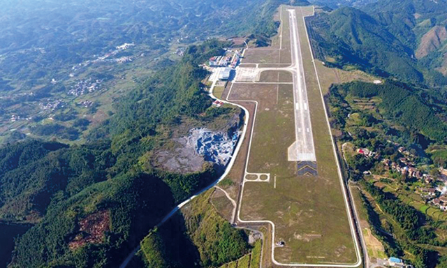 近2000個日日夜夜,那些高昂的山頭被削平了。大大小小的山頭被削掉了65座。航站樓、停機坪、住宿樓,一一建成,占據(jù)著方圓幾十畝地。高空俯視,像一只蝴蝶一樣翩翩而飛的候機樓,筆直平坦的跑道,綠油油的草坪,那樣錯落有致。四周的防護欄也豎起來了。建設(shè)者們甚至把桂花種到了懸崖邊上。