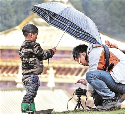 還有一張照片,被我珍藏了很久。那是我在藏區(qū),當時我外出拍攝,遇到了下雨。以我的性格我是不會選擇停工的,雖然沒法進行航拍,但是延時攝影還是要堅持做的。我把我的傘讓給了相機,自己淋雨操作。一個藏族的小孩子看到我當時的樣子,主動幫助我打傘,而他自己的身體倒是有一大半在外面淋著。我的同行伙伴,幫我記錄了這個瞬間。