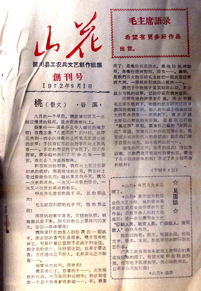 《山花》是由陜北著名詩(shī)人曹谷溪、已故著名作家路遙等人于1972年創(chuàng)辦的一張地方文藝小報(bào)。