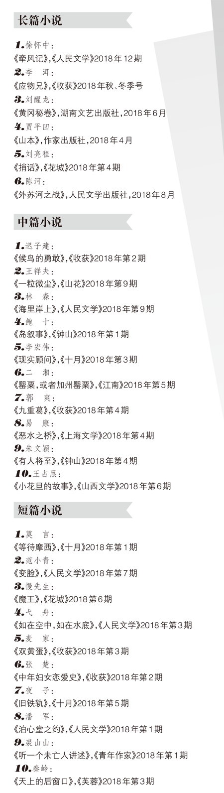 中國小說學會2018年度小說排行榜