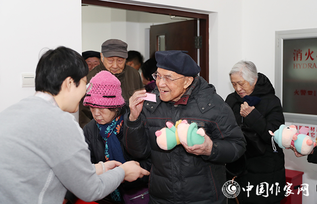 前來參加聯(lián)誼會的老同志們簽到,工作人員向老同志贈送新春吉祥物
