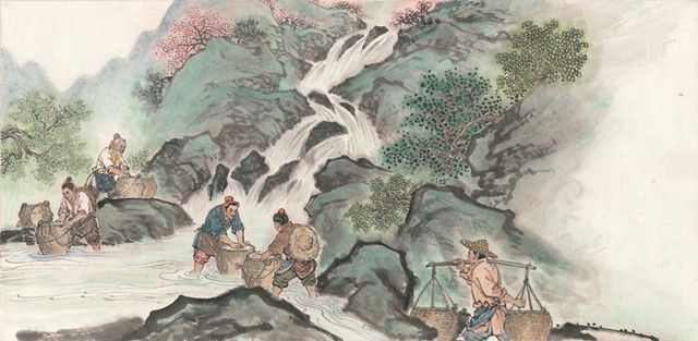這其中,濃濃的父子之情、手足之情、鄰里之情、師徒之情、朋友之情,中國(guó)人特有的人情味浸洇在簡(jiǎn)約靈動(dòng)的文字和氣韻生動(dòng)的水墨畫卷中。這種種繾綣的情感是中國(guó)人人文精神和人文情懷的延續(xù),樸素卻又溫暖。這是《瓷》中,家里媳婦的勤勞操持,將一家老小的日常生活打點(diǎn)得舒適溫馨;是《茶》中,茶人炒制茶青時(shí),父子搭檔、兄弟配合、鄰里互助的默契配合;是《紙》中,男孩們?cè)缭珙I(lǐng)悟到的對(duì)家庭的責(zé)任和擔(dān)當(dāng),將那份制紙的工作不急不緩地落在自己的手上,真誠(chéng)地接過,認(rèn)真地完成;更是《扇》中,做扇套的阿牛娘兒子生病了,扇子鋪的老板請(qǐng)伙計(jì)多給她一成工錢時(shí),人與人之間的信賴和扶持。